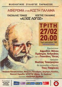 Την Τρίτη 27 Φεβρουαρίου 2024, ώρα 20:30, ημέρα επετείου από το μεγάλο ταξίδι του ποιητή προς την αιωνιότητα, θα παρουσιαστεί το έργο «ΑΞΙΟΣ ΛΟΓΟΣ» στον ιστορικό για την Λογοτεχνία χώρο «Φιλολογικός Σύλλογος Παρνασσός» (Πλατεία Καρύτση 8), όπου στεγάζεται αίθουσα αφιερωμένη στον Κωστή Παλαμά.