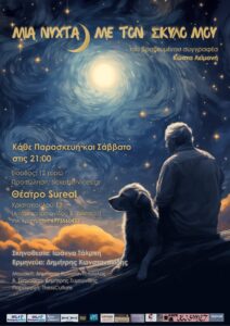 Το «Μια νύχτα με τον σκύλο μου» αποτελεί το τρίτο θεατρικό έργο του βραβευμένου συγγραφέα Κώστα Λεϊμονή, το οποίο ανεβαίνει στη θεατρική σκηνή σε πανελλήνια πρώτη στη Θεσσαλονίκη και στο Θέατρο Sureal.